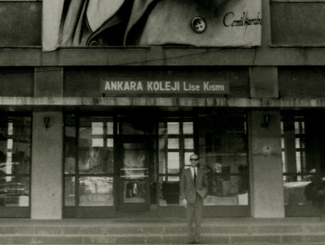 Cemil Karababa Kolejin kapısının önünde eseri ile birlikte