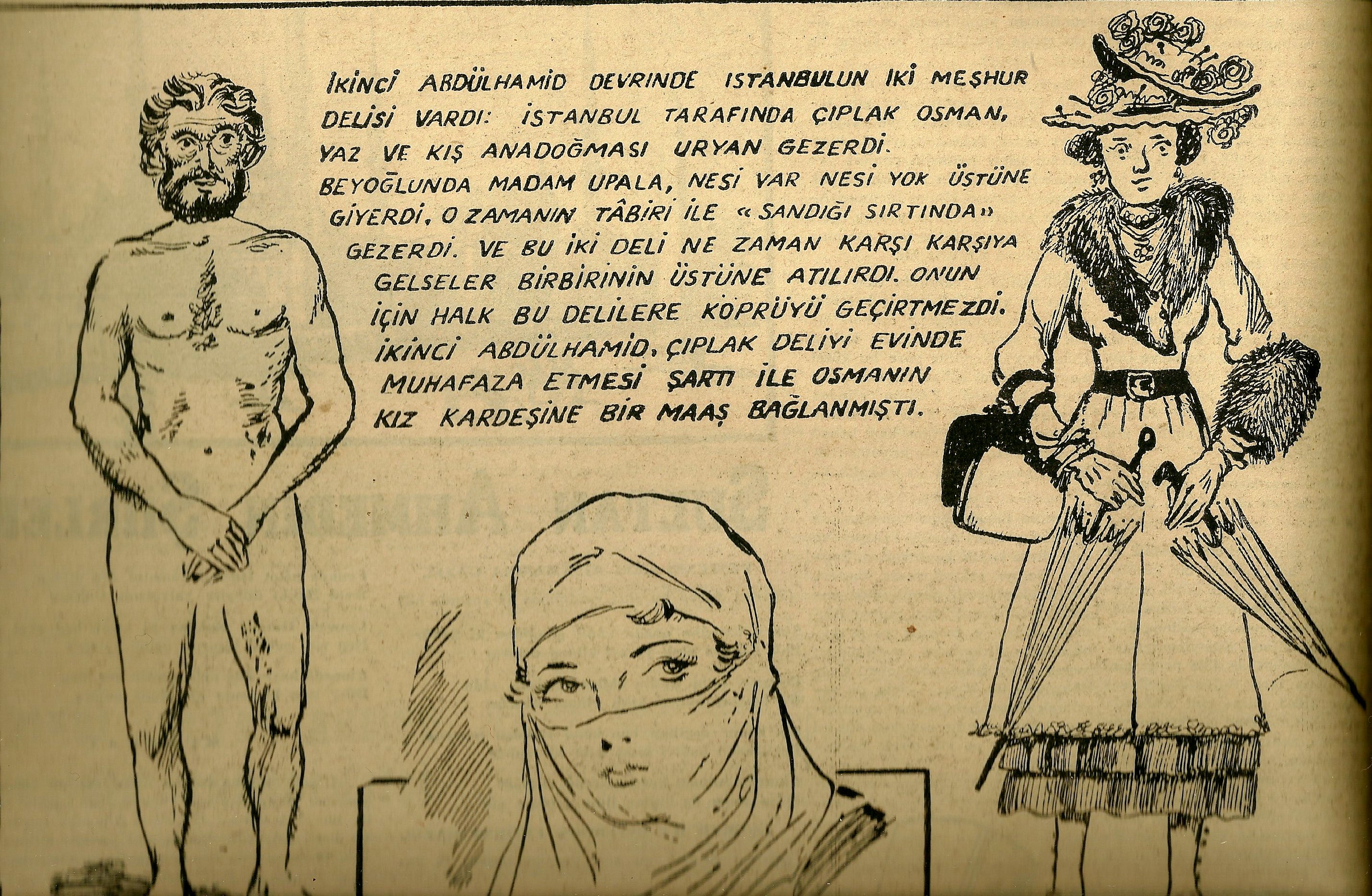 Bu yazı serisini kısaca bitirmek için daha gerilere Abdülhamit devrine kadar götürüp sonlandırmak istiyorum. Tarihçi Reşad Ekrem Koçudan alınan bir bilgi ile.. Abdülhamit devrinde İstanbul’da yaşayan iki renkli insan var. Birincisi anadan doğma çırılçıplak gezen bir adam, diğeri ise her şeyini üzerinde taşıyan bir madam. Beyoğlu’nda yaşayan Madam Upala ne zaman bu ademe rastlasa üzerine saldırır şemsiyesi ile dövermiş. Olayın devamı aşağıda Koçunun kitabından aldığım resimde yazılı…