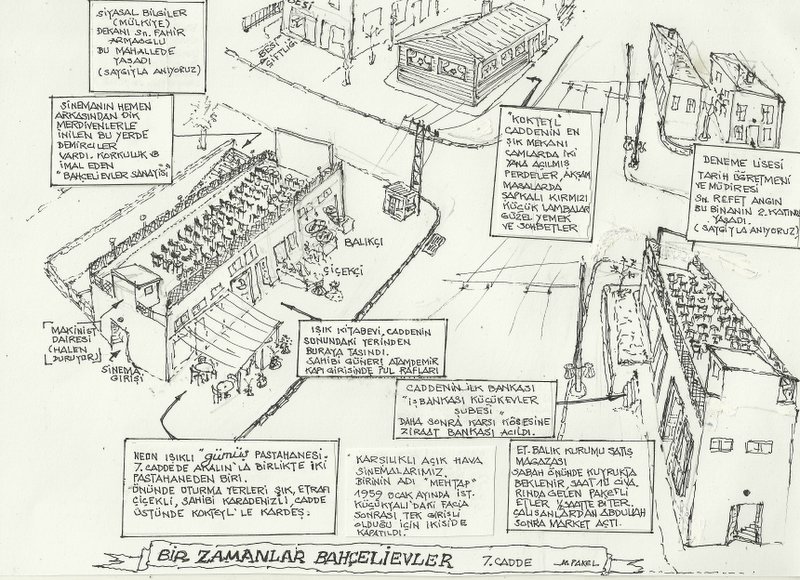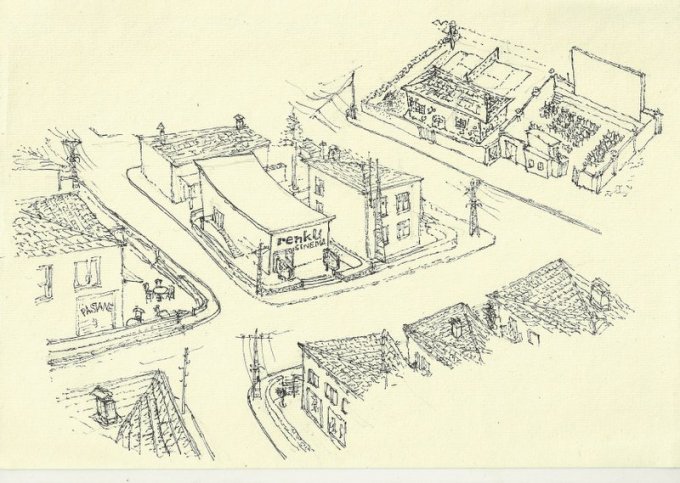 1950 yılları ekonomide rekabet yılları. Mehtap sineması açılınca yukarıda resmini gördüğünüz binanın ikinci katı yoktu ve hemen oraya semtin üçüncü açık hava sineması açıldı. Çarşının o günlerdeki durumunu alttaki çizimle vereyim.
