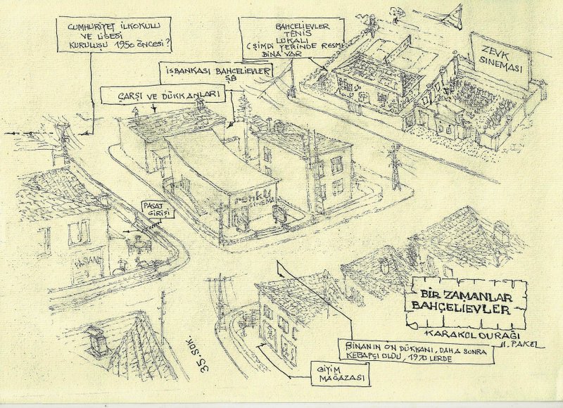 1952 Yılında yerleştiğimiz semtin adı “Küçük Evler” di, daha sonra “Yukarı Bahçelievler” ve en sonunda Bahçelievler oldu. Şimdi ki İş Bankası yine aynı yerinde, fakat daha ufaktı ve şube adı olarak “Küçük evler Şubesi” yazılıydı. 40 lı yıllara doğru, büyüyen Ankara’da önce Tandoğan meydanı yakınında “Mebus Evleri” yapıldı ve ondan hemen sonra “Beş Evler ” Yapı kooperatifi binaları tamamlandı. Beşevler’le Birinci cadde arasında kuzeyden güneye doğru, yani son durak tarafındaki eski Süvari alayı ve Muhafız alayı yakınından, Anıt Kabirin yapıldığı Rasattepe’nin önünden , Gazi Eğitim Enstitüsüne doğru giden bir dere vardı. Halk arasında bu derenin adı B…lu Dereydi. Deyiş tamamen doğruydu, bu derede resmen kanalizasyon akardı. Bahçelievler’de kooperatif inşaatlarının başlaması üzerine buraya bir köprü yapıldı. ( Şimdi ki Darphanenin yakınlarına ) Emlak Bankası evleri Bahçelievler’in girişinden şimdi ki altıncı caddeye kadar olan bölümdeydi. Şu anda 3. cadde üzerinde bu binalardan bazıları orijinal haliyle durmaktadır. Çok iyi planlanmış bu ilk Bahçelievler’de bir tenis kulübü ( Şimdi Emekli sandığı işlem binası olan yer ) Çarşısı, postanesi ve bir açık hava sineması bulunmaktaydı. o günlere ait bir çizimi aşağıya ekliyorum.