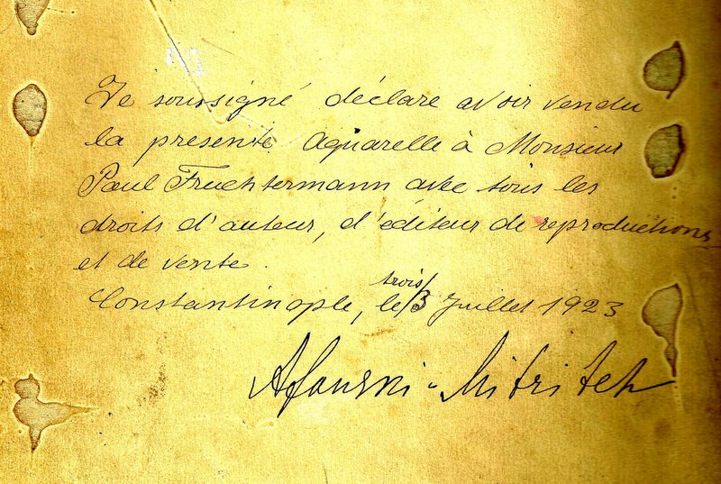 Resimlerin hepsinin arkası, o günlerin İstanbul’da en geçerli lisanı olan Fransızcayla yazılmış. Metnin kaligrafisinden yazıyı Mösyö Paul’un yazdığı ve Mitrich’in imzaladığı anlaşılıyor. Tarih 3 Temmuz 1923 Mitrich’in İstanbul’da kaç sene kaldığı bilinmiyor, sadece iki yorum var. Birincisi, kaldığı yıllarda resme fazla ilgi olmadığı için zor günler geçirdiği ve borçlarına karşılık bu resimleri Mösyö Paul’e verdiği, Diğeri ise, Mösyö Paul’ün bu resimleri satın aldığı. Bana bu ikinci daha doğru geliyor yazılan Fransızca metinde tüm haklarının devredildiği yazılmış. Mösyü Paul bu resimlerin tutulacağına inanmış ve daha sonra bazılarından kartpostal yaptırarak bastırmış. İşte babamın koleksiyonundaki resmin hikayesi.