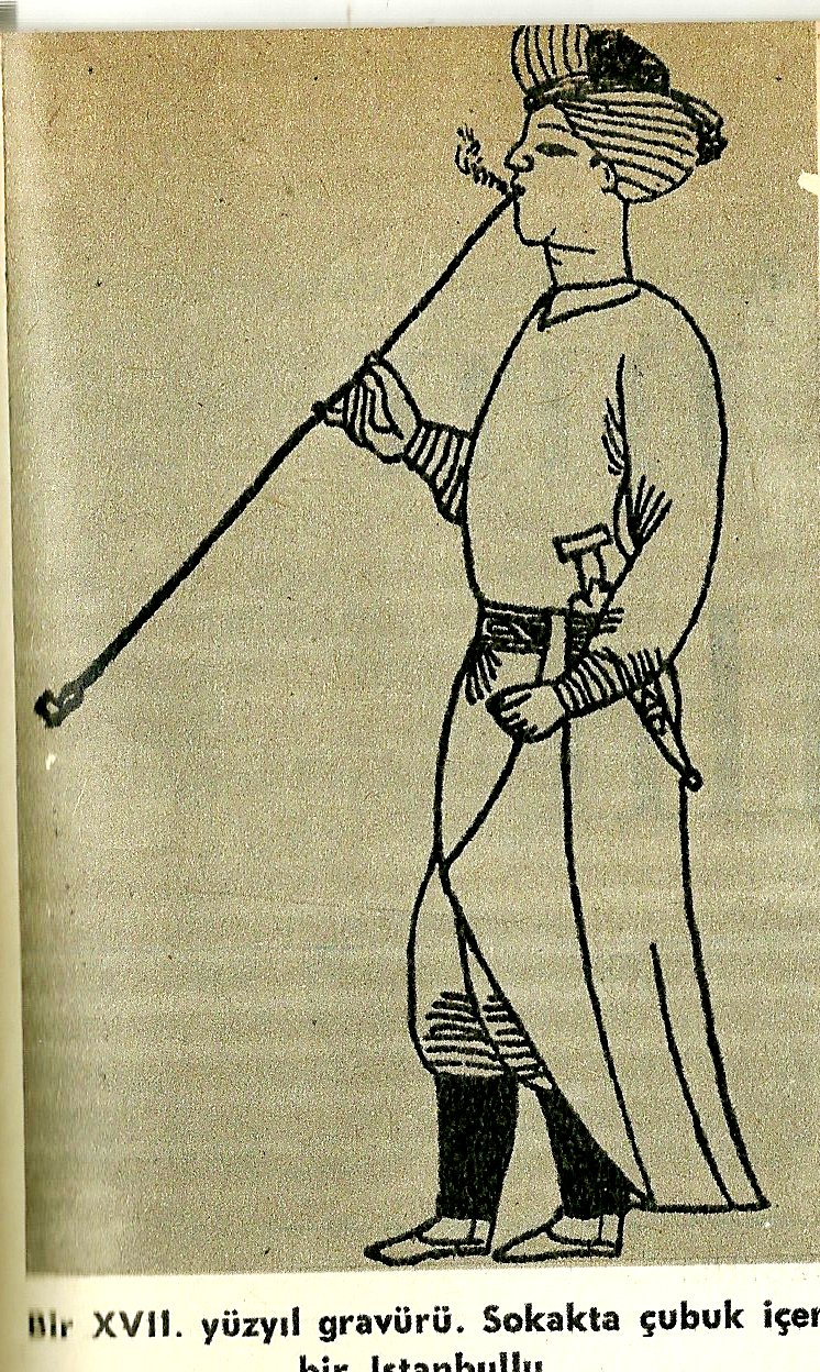 İngiliz gemileri ile tanıştığımız tütün çok çabuk yayılıyor ve halk ona hemen bir isim buluyor, ‘Çubuk Tiryakiliği’, zira tütün çubuk ile içiliyor. Bunu size kısaca tarif edeyim. En ucunda tütünün yerleştirildiği lüle taşından yapılmış hazne var, buna ortası boş ağaçtan yapılmış bir çubuk takılıyor ve ağızlık olarak ‘imame’ denilen bir parça ile tamamlanıyor. Oturduğunuz yerde içecekseniz bu çubukların boyu iki, iki buçuk metreye kadar değişiyor, ama yanınızda taşıyacaksanız daha kısa olabiliyor. On yedinci yüzyıla ait bir gravürden alınan resmi ekliyorum.