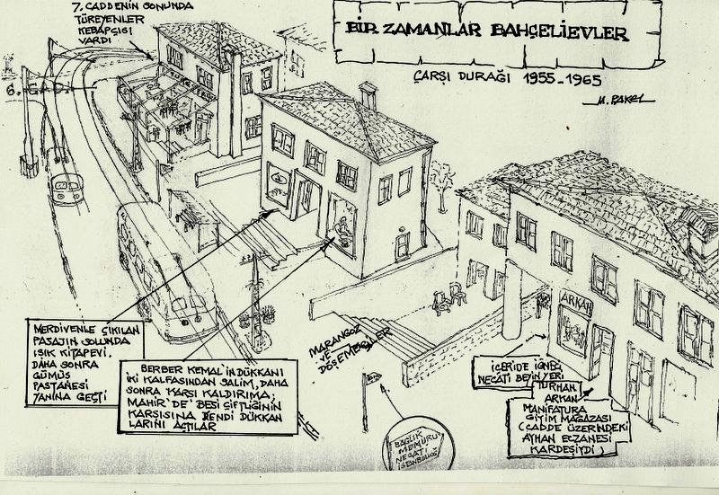 Yukarıdaki çizimi internetten aldım, çizen mimarın adı okunamıyor. Bu, İstanbul’un Anadolu yakasındaki en güzel tren istasyonu. Bu sıradan görünümlü istasyon için “neden güzel?” derseniz, cevabım, “benim orada yaşadığım güzel anılardır” derim. Anadolu tarafındaki Kızıltoprak, Göztepe, Erenköy, Suadiye, Bostancı İstasyonları Fransız mimarlar tarafından tasarlandı, hepsinde ince bir zevk vardır. Anneannemin erkek kardeşi yani büyük dayım, Sait bey, Suriye’ye yerleşmişti, Osmanlı zamanında, oradan evlendi ve terk etmedi, Hemen her sene kız kardeşini ziyarete gelirdi, Erenköy’deki büyük bağ evine, ve çoğunlukla yaza denk geldiği için hep karşılaşırdık. Öğleden sonra serinliğe doğru, şapkasını giyer, bastonunu alır, beni elimden tutar, bu şık giyimli adamla ufacık bir çocuk bu istasyona gelirdik. Benim için büyük keyifti, çizimde görünmeyen ve bugün yerinde olmayan çınarın altındaki küçük Büfenin, (o zamanlar Fransızca’dan bozma ‘Büvet’ kelimesi ile yazılırdı ) masalarından birine otururduk. Ev yapımı soğuk limonatamı içerken, o da kahvesini yudumlardı. Çocukluğumun yazlarını geçirdiğim Erenköy’e bu sene yine uğradım, aşağıdaki resim çarşının son hali.