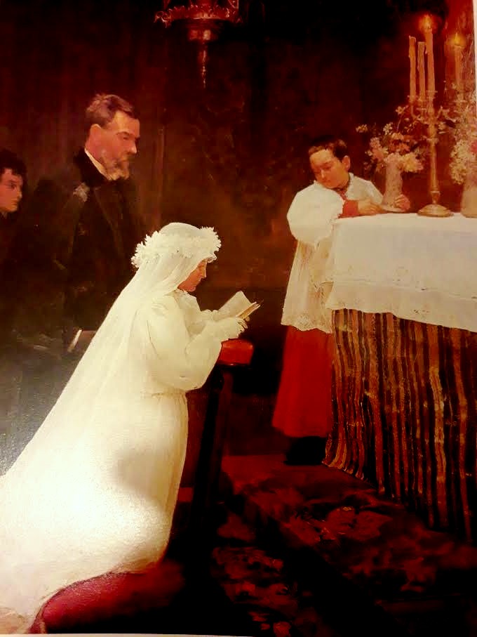 Resimlerde en zor beyaz rengi çalışmaktır. Rahibin karşısındaki genç kızın gelinliğinin bütün kıvrımları, dantelleri özenle işlenmişti. Kürsüye serilen örtünün renk zenginliği ve detayları şaşırtıcıydı. O gün ilk defa oğlunu kıskandığını fark etti. Yaratan, ona, kendisine vermediği yeteneği bolca vermişti. Bu tablonun küçük boyutta olduğunu sanmayın eni 116 santim, boyu ise 118 santimdi. Bu resimden sonra yaptığı ikinci resmini de aşağıya alıyorum.