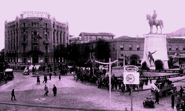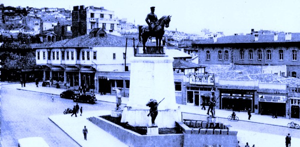 Yukarıda gördüğünüz ‘Hakimiyeti Milliye’ yani Ulus Meydanındaki fotoğraf yine bir bayram günü çekilmiş, hangi yıl olduğunu tam bilmiyoruz ama İş bankası binası olduğuna göre muhtemelen 1930 dan sonra, ama sabah saat ona yirmi kala çekildiğini eski İş Bankasının kumbara şeklindeki meydan saatinden öğreniyoruz. Heykelin arkasındaki taş bina ise ünlü ‘Taşhan’ Cumhuriyetin ilk yıllarında birçok ünlüyü konuk etmiş ama en önemlisi daha önce de yazdığımız Karpovitch in ‘Karpiç’ lokantası bu handa açılmış. Alttaki resim ise yine aynı meydandan, bu sefer heykelin sağında görülen bina eski öğretmen okulu, Cumhuriyetimizin ilk Milli Eğitim Bakanlığı işte bu binaya yerleşmiş.
