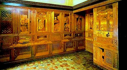 Dükün siyasi yönüne pek girmeden gücünü adamlarından aldığını ve giriştiği hiçbir savaşı kaybetmediğini not edelim. Onun çirkin burun görünüşüne bir de sağ gözünü kaybetmesi eklenmiş. Tek gözle daha iyi görebilmek amacıyla burun kemiğini o günkü şartlarda aldırıyor. Beni gezdiren İtalyan arkadaşım, ‘Aslında çok da çapkındı, sağ tarafta oturan kadınları daha iyi görmek için bütün riskleri aldı’ diye anlatmıştı doğru mu bilemem ama eşi Beatrice’ye tutkun olduğu yazılıyor. Bizi ilgilendiren Dükün ‘Sanatçı ve bilge ‘ insanlara olan tutkusu yalnızca. Aşağıya aldığım çalışma odalarından sadece birisi, tamamı ahşap ve hepsi oyma işçiliği.