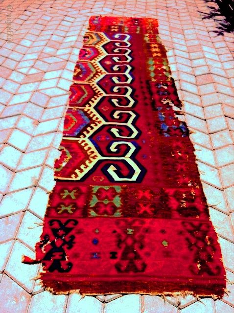 Yukarıdaki fotoğrafı İnternetten aldım. Gördüğünüz kilim bir ‘Hotamış’ kilimi. İki parça halinde dokunup sonradan birleştirilen kilimin bir kanadı. Bir asırı görmüş ve yaşamış bir kilim. Ben Hotamış adını ilk defa 80 li yıllarda Bodrum’da kilim ticareti yaparken duydum. Dükkâna gelen bir kişi, ‘Bu kilimi alır mısınız’ diye sormuş ve önüme, katlanmış bir kilimi açmıştı. Lacivert, koyu kırmızı ve turuncu renklerle dokunmuş müthiş bir sanat eseriydi. Kendisinin Hotamış’lı olduğunu, orada dokunduğunu söylemişti.