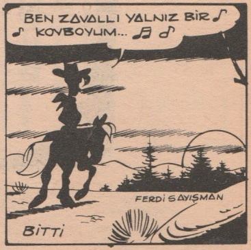 Bu arada bir kaliğraf-çizerimizin adını anmadan geçemeyeceğim. Red Kit adını onun koyduğunu ve birçok espriyi bizim anlayışımıza göre yeniden yazdığını biliyoruz. Red Kit kapaklarının çoğu onun çizimidir. Ferdi Sayışman bize onu daha çok sevdiren çizerimizdi.