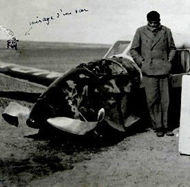 1935 yılı Aralık ayının 30. Günü gece saat üçe doğru Büyük Sahranın en doğusunda tek pervaneli uçağın motoru durdu. Gece karanlığında süzülerek yere doğru alçalmaya başladılar, şansları vardı, altlarında alabildiğince uzanan çöl kumundan başka bir şey yoktu. Gövde üzerine iniş yaptılar. On dokuz saattir uçağı kullanan Exupery ve teknisyen Andre hiç yara almadan kurtulmuşlardı. Ertesi sabah olayı görüntülemek için aşağıdaki fotoğrafı çektiler.