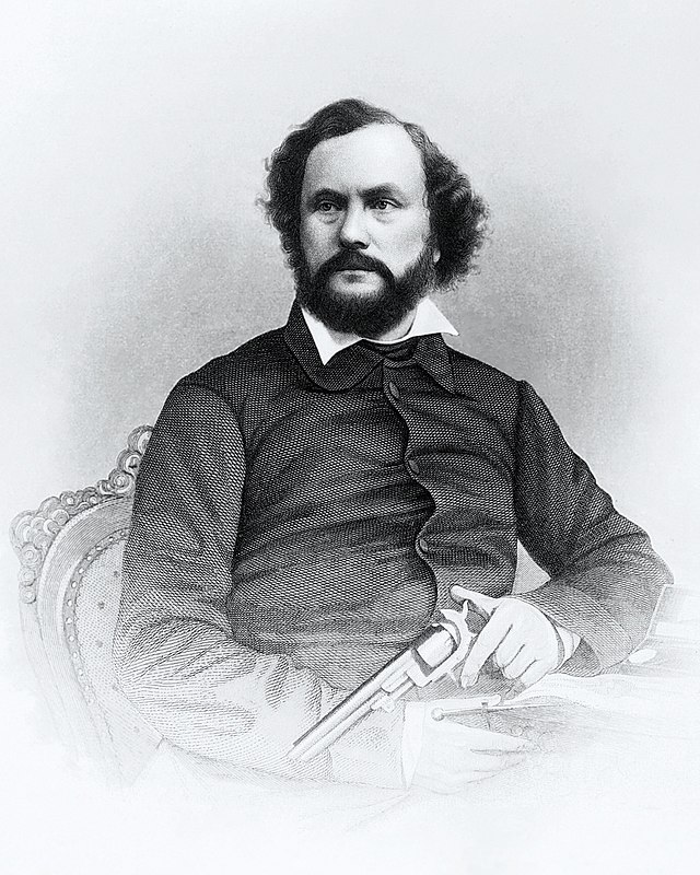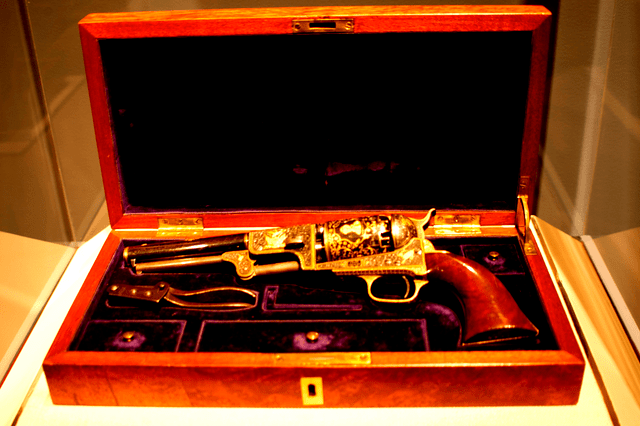 Tamamen altın işlemeli olarak yapılmış olan bu tabanca hepimizin yakından, kovboy filmlerinden tanıdığımız ‘Colt’ toplu tabancası. Evet, tabancayı hediye eden Samuel Colt, kendi adıyla anılan ‘Colt’ tabancalarının yaratıcısı ve üreticisi olarak ülkemize gelmiş. Kendisinden sonra işlerinin başına yeğeni Samuel P. Colt geçer. İşte en üstte verdiğim fotoğraflar bu aileye ait olan ‘Colt Çiftliğinin arazisinde çekilmiş.