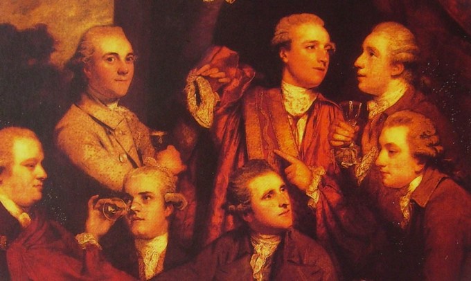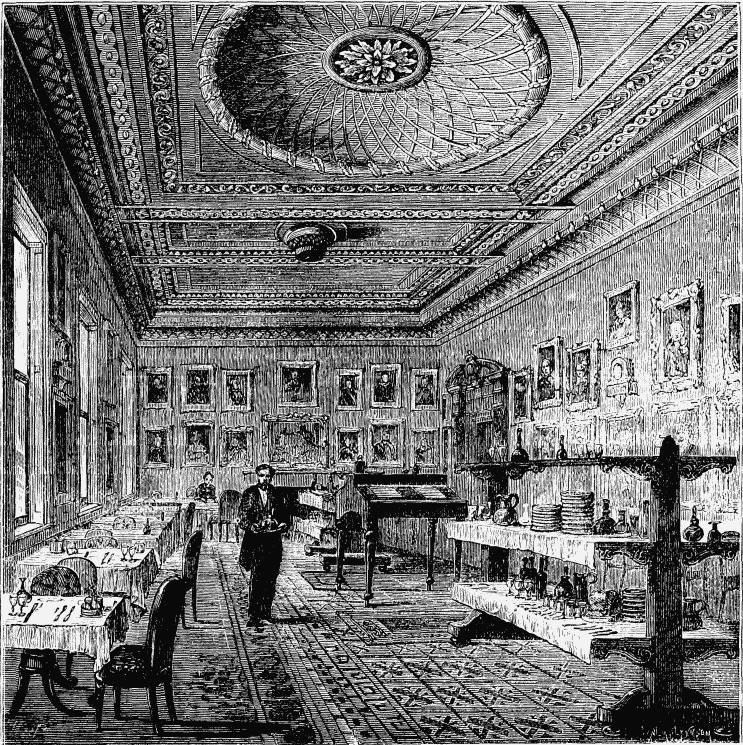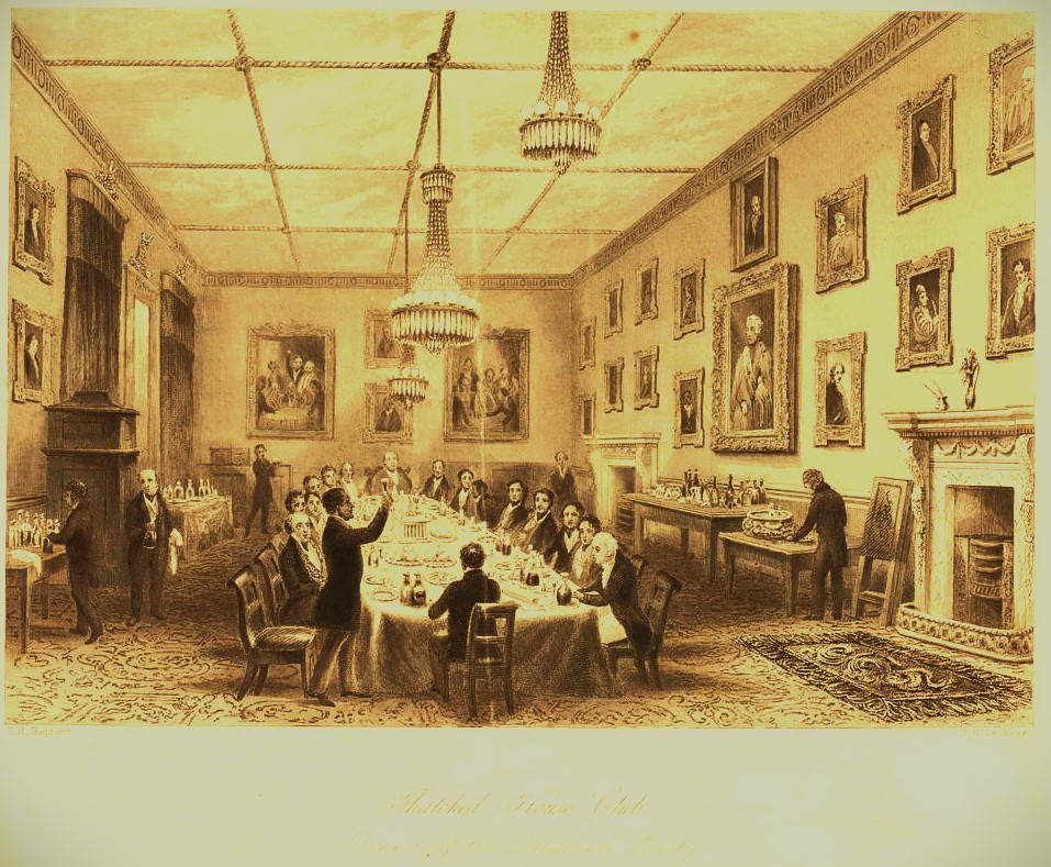 18. Yüzyılda Londra’da kulüp ve cemiyetler oldukça yaygın. Buluşma yerlerinin ortak özelliği, geniş bir yemek salonu, duvarların yağlı boya resimlerle kaplı olması. Bir örneğini aşağıya alıyorum.