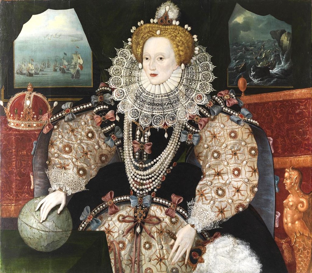 Bir eliyle tuttuğu Dünyanın hâkimi olduğunu betimleyen tabloya Kraliçenin gerçek gücü olan ‘deniz filosu’ da eklenmiş.