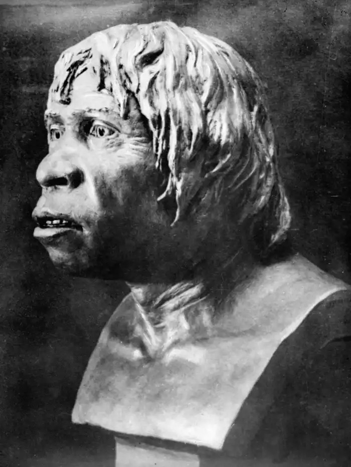 Buluntu insanla, şempanze karışımı gibiydi, illüstratörler onu aşağıdaki fotoğrafta görüldüğü gibi resimlediler.
