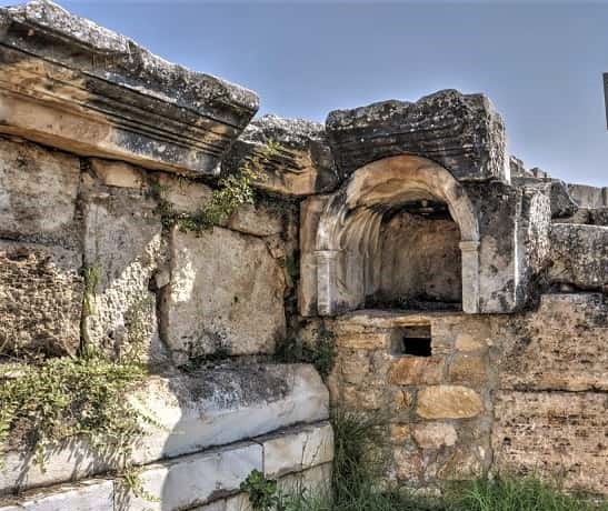 ‘14. Bölüm Karyalılarla Nysa arazisi arasında bulunan Meseogis aşıldığında bazı kentlere gelinir. Nysa, Kibyratis ve Kabalis’e kadar uzanan Maiandros (Menderes) un öte tarafındadır. İlk önce Mesogis’in yakınında Laodikeia’nın karşısında Hierapolis vardır. Burada sıcak su kaynakları ve Ploutonion bulunur. Bunların her ikisi de olağanüstüdür. Kaynakların suyu o kadar çabuk donar ve taşlaşır ki, insanlar bu suyu çukurlara akıtarak yekpare taş çitler yapmaktadır. Ploutonion’a gelince; Dağın bir parçası olan yüksekçe bir tepenin eteğinde, bir kişinin ancak geçebileceği orta büyüklükte bir çukur vardır. Derinliği oldukça fazladır ve bu çukurun çevresi yaklaşık yarım plethron olan dikdörtgen bir parmaklıkla kapatılmıştır. Burası o kadar yoğun ve puslu bir buharla doludur ki, insan zemini zorlukla görebilir. Parmaklığın çevresine yaklaşan herhangi bir kimse için hava zararsızdır, çünkü sakin hava da buhar dışarı çıkmaz; fakat parmaklıktan içeri geçen herhangi bir hayvan derhal ölür. Oraya sokulan boğalar düşerler ve ölürler. Ben içeriye güvercinler attım hemen öldüler. Fakat hadım olan Galler (Kybele rahipleri) içeriye rahatlıkla girer, çukura yaklaşır, sarkar hatta nefeslerini tutarak bu sayede (ben onların yüzlerinde kusacakmış gibi bir ifade gördüm) belirli bir derinliğe kadar inerler.’ Strabon anlatısının devamına kendi yorumunu ekler. ‘ Bunlar gibi sakatlanmış (hadım) olmak veya sadece tapınağın çevresinde yaşamak ya da Tanrısal bir takdire mazhariyet veya da buhara karşı panzehir olarak kullanılan belirli fiziksel güçlere sahip olmak, acaba bu bağışıklığın nedeni olabilir mi?’ (Strabon-Coğrafya, Arkeoloji ve Sanat Yayınları s:179-180)