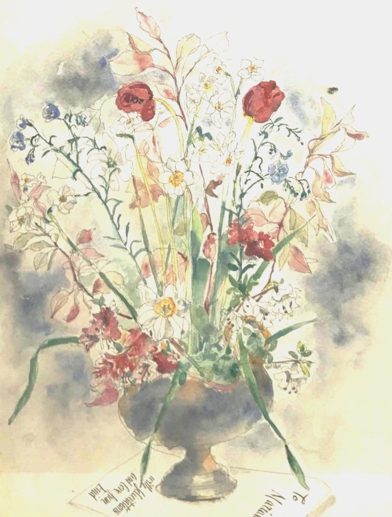 Arta kalan zamanlarını resim yaparak dolduruyor. Arkadaşlarına özel günlerde hediye olarak çiçek götürmek yerine kendi çizdiği resimleri veriyor. Aşağıya bir örnek olarak ‘Sevgilerini ileten yazısının üzerinde kır çiçekleri’ sulu boya eserini alıyorum.