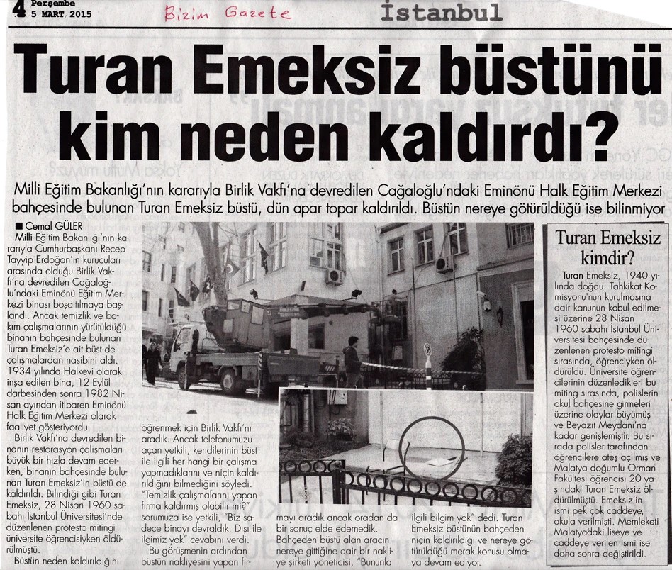 Bu da yetmemiş gibi Cağaloğlu’nda eski Milli Türk Talebe Birliği önünde bulunan aşağıda gördüğünüz büstün yerinden kaldırıldığı haberini basınımız yayınladı.