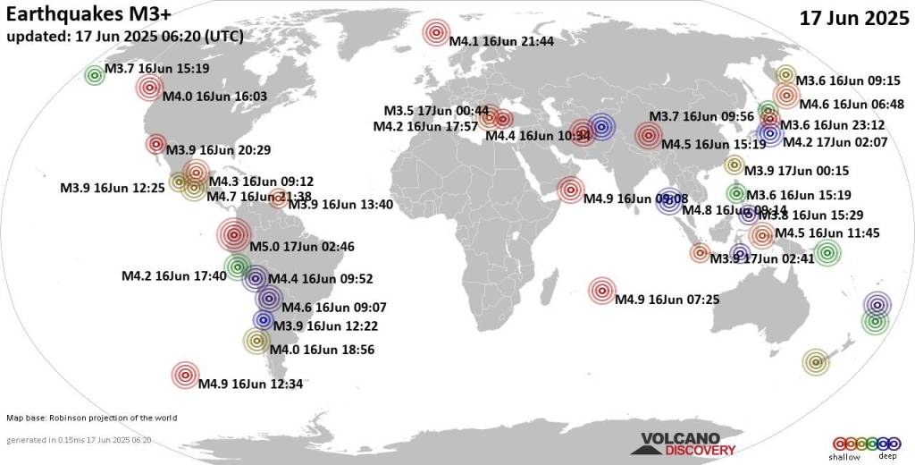 Bu çalışmayı yapan ‘Volcano Discovery’ sitesi aynı zamanda güncel depremleri de izliyor. Volkanik olaylarla depremler arasındaki ilişki şaşırtıcı gelebilir, anlaşılan Dünyamızın güçlü iç basıncını tek başına volkanlar karşılayamıyor. Aşağıda bu sefer aynı güne ait depremleri görüyorsunuz.