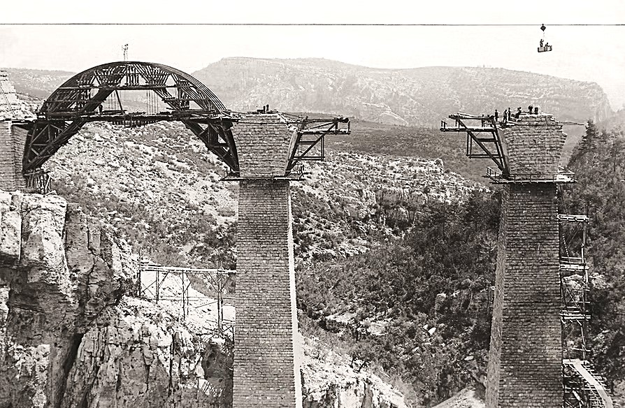 Öncelikle bu köprüyü kimlerin yaptığını hatırlayalım, Almanların dışında İskandinavlar, özellikle İsveçliler ve Avrupa’nın çeşitli yerlerinden gelenlerle beş bin kişilik bir ekip.. Alta aldığım fotoğraf, kemerler yapılırken çekilmiş, gördüğünüz gibi karşıdan karşıya çekilen halatla malzemeler havadan taşınıyor. Yani ‘Var da’ diyerek aşağıdan yukarı değil.
