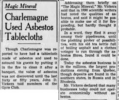 Yanmaz masa örtüleri’ olarak. Rivayete göre, Şarlman, yemek ziyafetlerinde, sarhoş olan misafirlerinin ikide bir mumları devirerek örtüleri yakması üzerine, ‘Yanmaz Örtü Yapın’ komutu ile tamamen Asbest liflerinden üretmişler örtüleri.