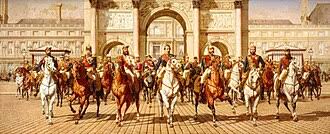 1867 yılında Paris’te düzenlenen ‘Uluslararası Fuarın’ açılış seremonisinde, ‘Avrupa’nın İmparatorlarını’ Avenue des Champs-Élysées (Şanzelize Bulvarında) resmetmiş Charles Porion. Sağdan ikinci, beyaz atın üstünde Osmanlı İmparatoru Abdülaziz, yanında Rus çarı II. Aleksander ve onun yanında Fransa İmparatoru III. Napolyon görülüyor.
