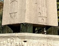 Bronz ayakların oturduğu ‘Rölyefli kaide’ daha yumuşak bir taş olan Marmara Adası mermerlerinden yapılmış ancak dört köşesine yerleştirilen ‘granit köşe taşları’ ile zemine bağlanmıştır. (Aşağıdaki fotoğrafta daha koyu renkte gördüğünüz şekilsiz taşlar bu granitlerdir)
