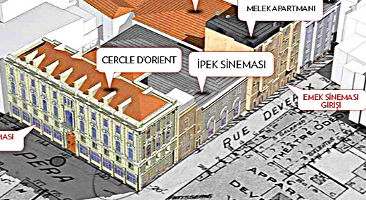 Fotoğraf İstanbul’da Beyoğlu İstiklal caddesinde MimarAleksandre Vallaury’nin 1800 lü yılların sonlarına doğru yaptığı muhteşem binayı gösteriyor. Binaya o zamanlar ‘Cercle d’Orient’ (Türkçemize okunduğu gibi Serkildoryan olarak geçmiş) adını vermişler, Doğu (Şark) Çemberi anlamına geliyor. Elit, Levantenlerin toplantı yeri olan binanın yanında dar bir geçit olarak açılan sokağa ise, ‘Rue de Deveaux’ adı verilmiş. Pera’nın planlarını Fransız Mimarların yaptığını bir önceki yazımızda belirtmiştik, bu nedenle tüm planlarda sokak isimleri, sokaktaki ‘Ünlü’ lere göre adlandırılmış. (Aşağıya aldığım güzel çizimin kaynağı ‘Emek Hepimizin’ sitesinden, 1924’ten Günümüze Emek Sineması’nın Hikâyesi’ yazısından)