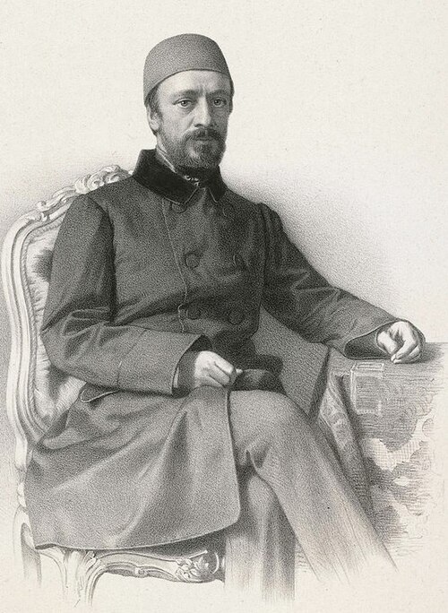 Oturan Devlet adamlarının tam arkasında ortada duruyor. (Günümüzden yüz yetmiş sene önce imzalanan Paris Anlaşmasının ikinci Maddesi ilginç, bu maddeye göre Osmanlı Devleti ‘Avrupa Devleti’ sayılıyor. Toplantının arkasından zeki Diplomat, bu maddeye dayanarak. ‘Madem ki artık birlikteyiz, o zaman ‘özel imtiyazların’ (Kapitülasyonlar) da kaldırmanın zamanı gelmedi mi?’ sorusu, iş Ülkelerinin çıkarları olunca anında geçiştiriliyor.) Yazısının da çok güzel olduğu biliniyor hatta ölümünden sonra Bismarck onun yazı takımının kendisine hediye edilmesi için istekte bulunuyor.
