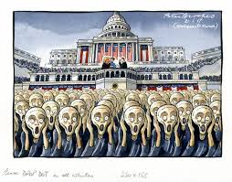 Çizim Peter Brookes tarafından, günümüz Dünyasını ‘İnsanlığı bırakıp Savaşın’ içine sürükleyen ABD Liderinin seçim sonrası 2017 yılında çizilmiş.